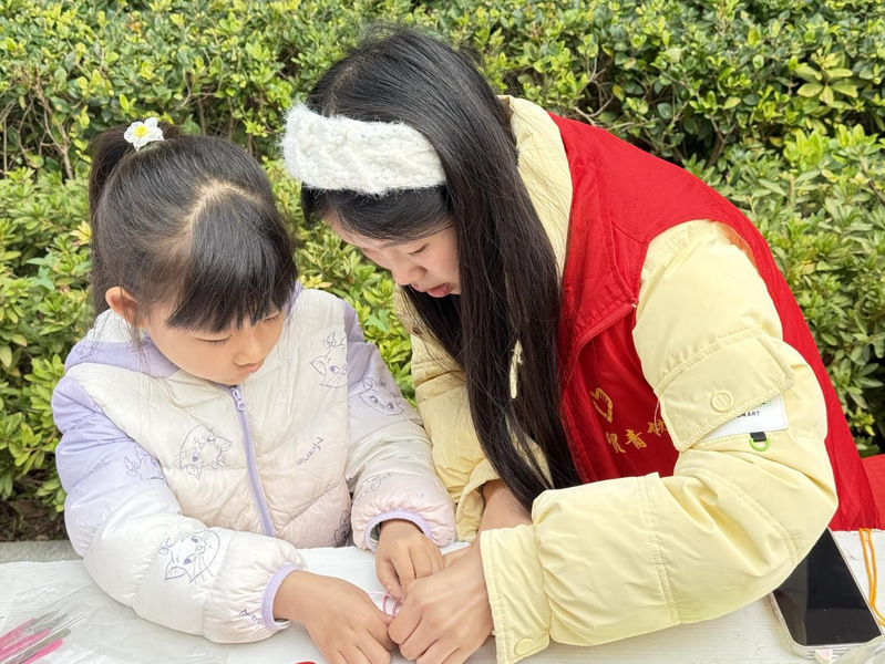 志愿者细心引导小朋友编制中国结